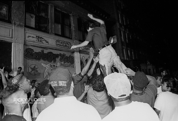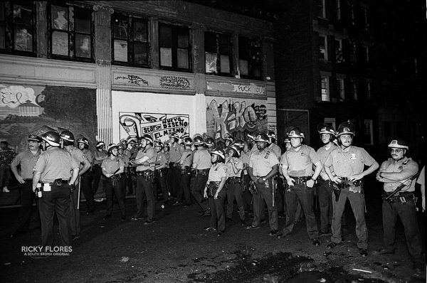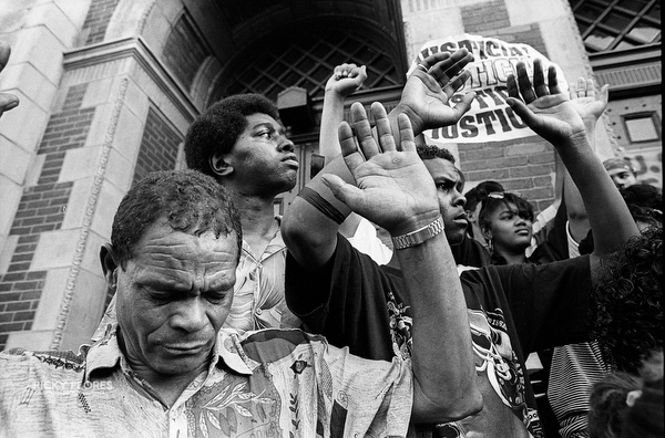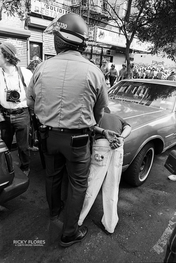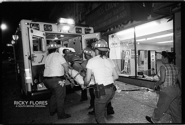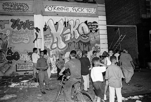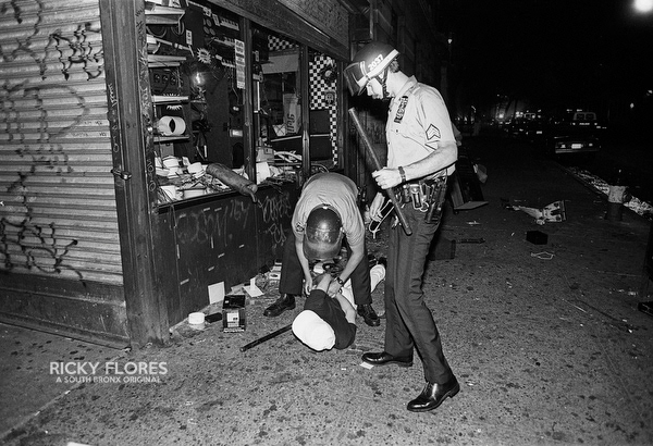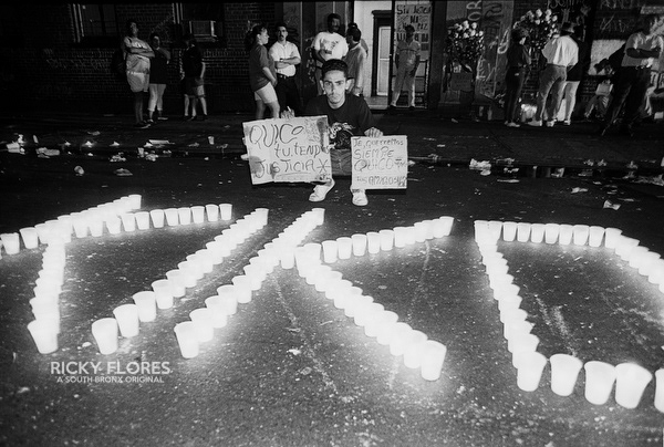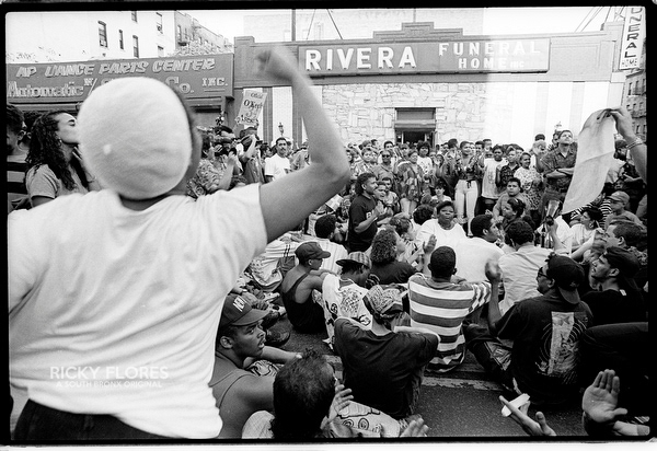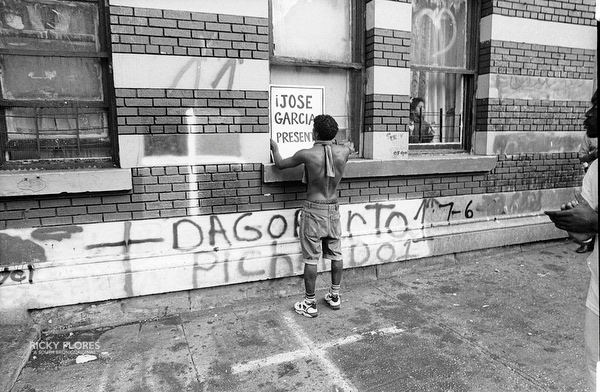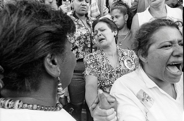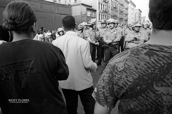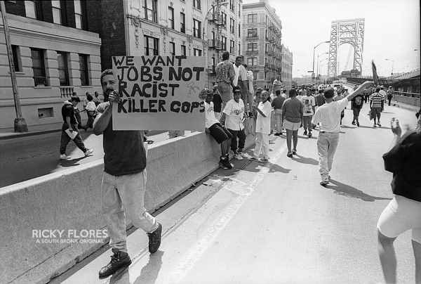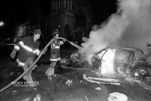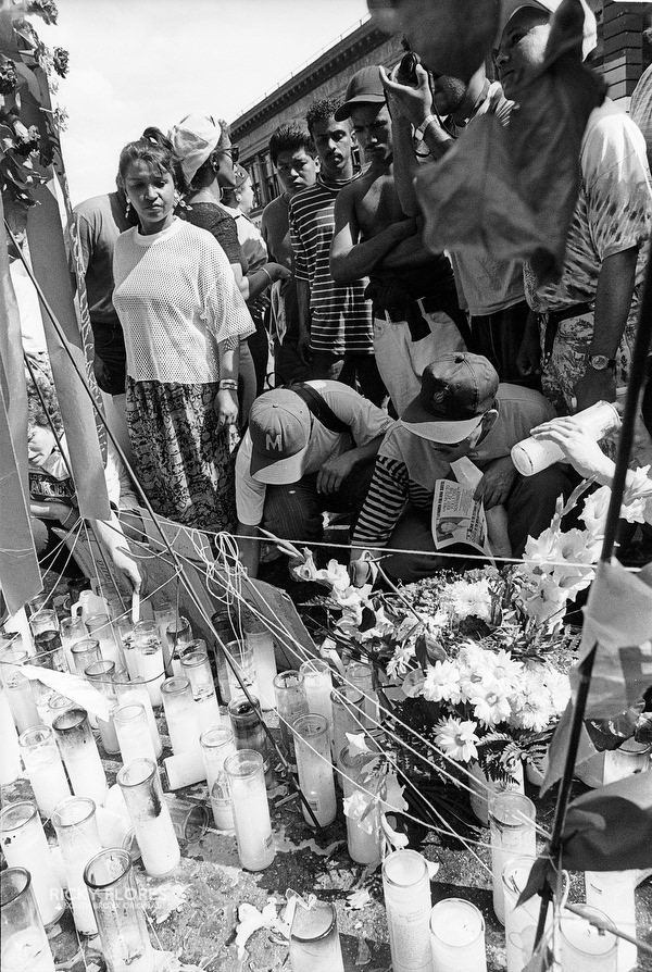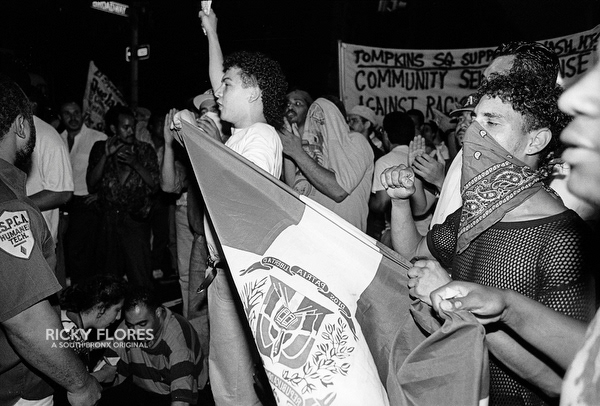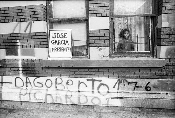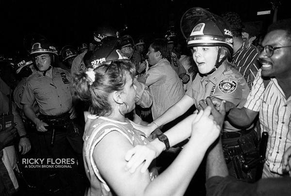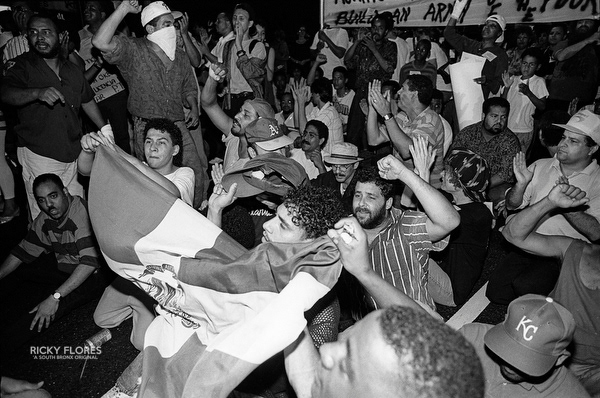 Demonstrations in Washington Heights in July of 1992 in the wake of the shooting of Jose "Kiko" Garcia by an undercover police officer during a drug sweep of the neighborhood. These photos were taken over a several days, between the 6th through the 8th. The ensuing violence resulted in major property damage to storefronts and vehicles. Street fires were set and ranged from 125th Street on St. Nicholas Avenue to the Inwood section of Manhattan. During the rioting one man died while falling from a rooftop while being chased by police and 11 people were arrested. To the horror of the family members of Dagoberto Pichardo, the man who died over night, a FDNY fire fighter was hurt while responding to one of numerous calls to turn off a fire set by rioters. The family led a march to the fire house in support of the injured fire fighter and and to beg forgiveness.